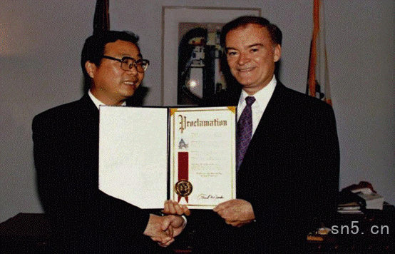 (1995年10月2日,美国旧金山市市长弗兰克•姆•佐敦给来辉武颁发“旧金山市来辉武教授日”证书)