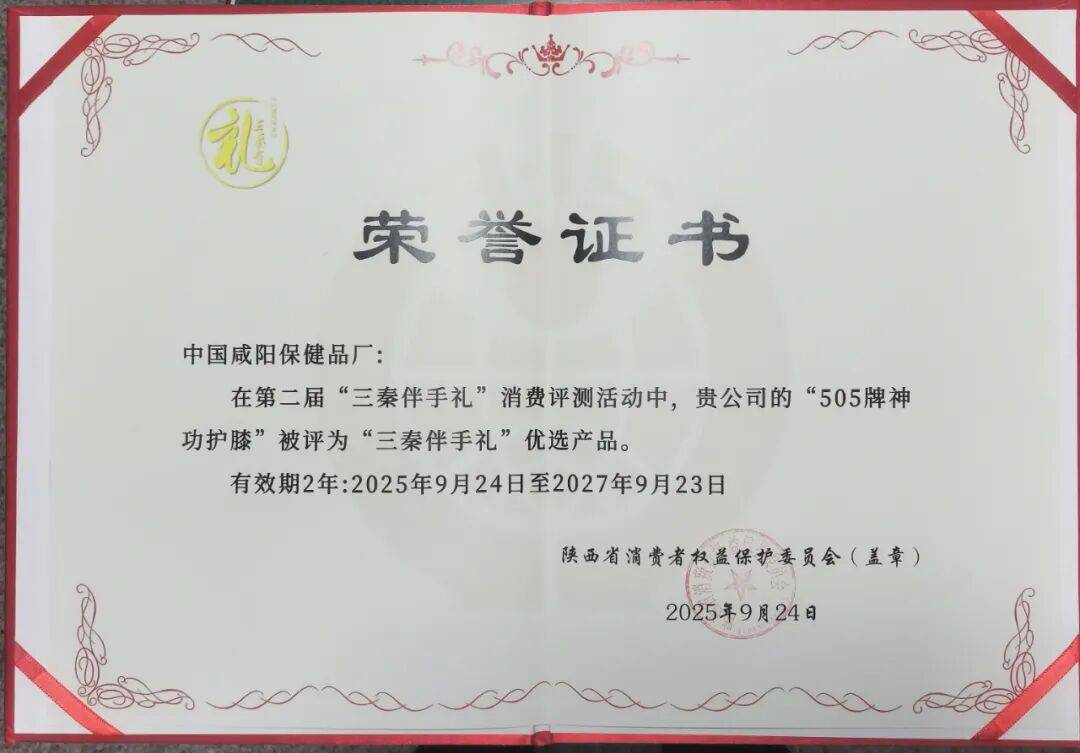 在本次评选中,中国咸阳保健品厂出品的505牌神功护膝凭借卓越品质与深厚文化底蕴,从众多优秀产品中脱颖而出,成功入选“三秦伴手礼”优选产品,为陕西特色消费品树立了新标杆。
