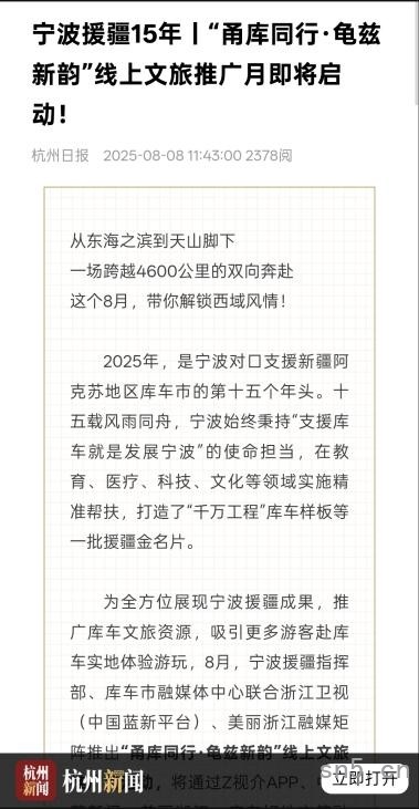 本次“甬库同行·龟兹新韵”线上推广月活动,通过主流媒体引领、社交媒体助推、国际传播赋能与多平台资源整合,全面呈现宁波与库车十五年协作成果与深情厚谊,显著提升了两地品牌形象与社会影响力。