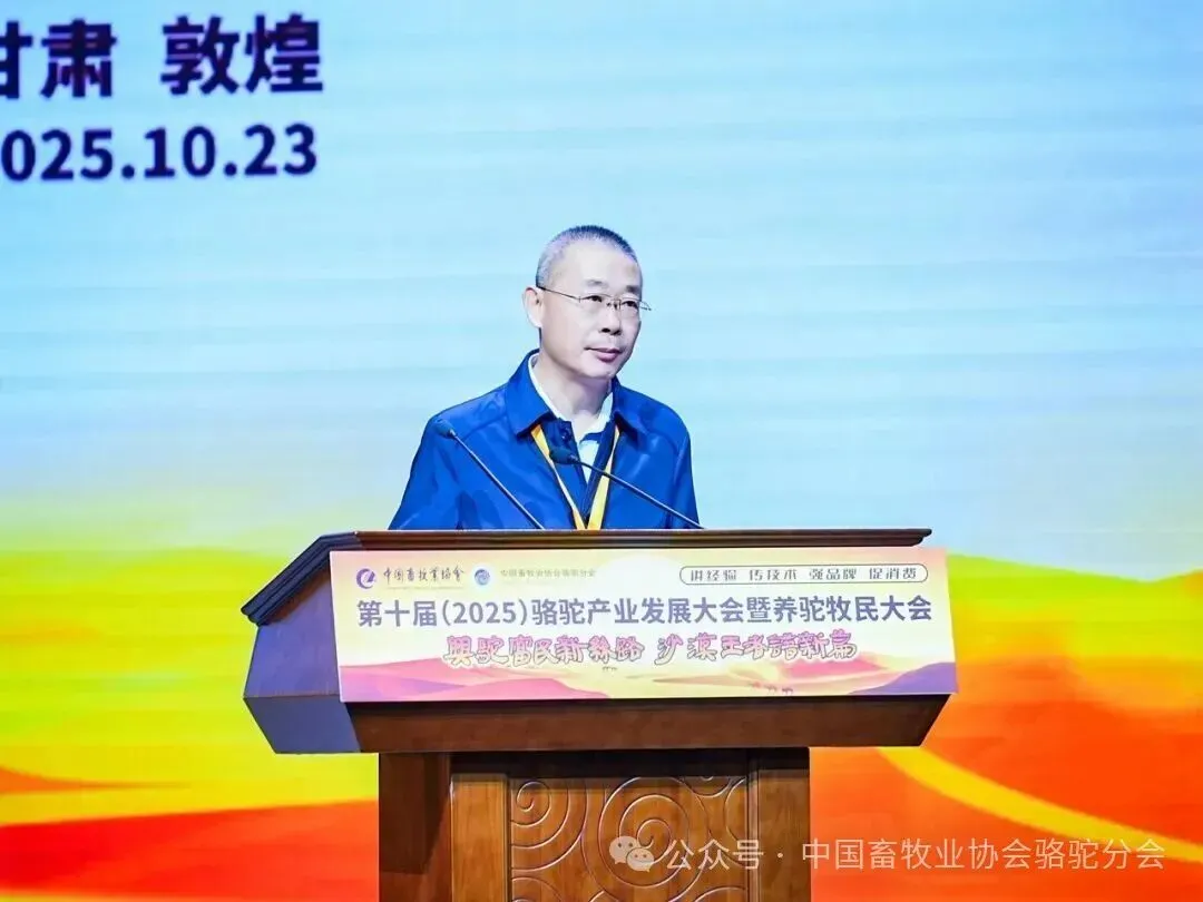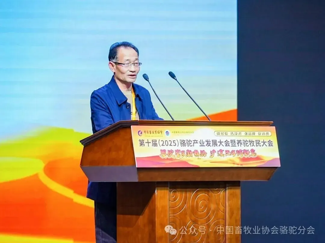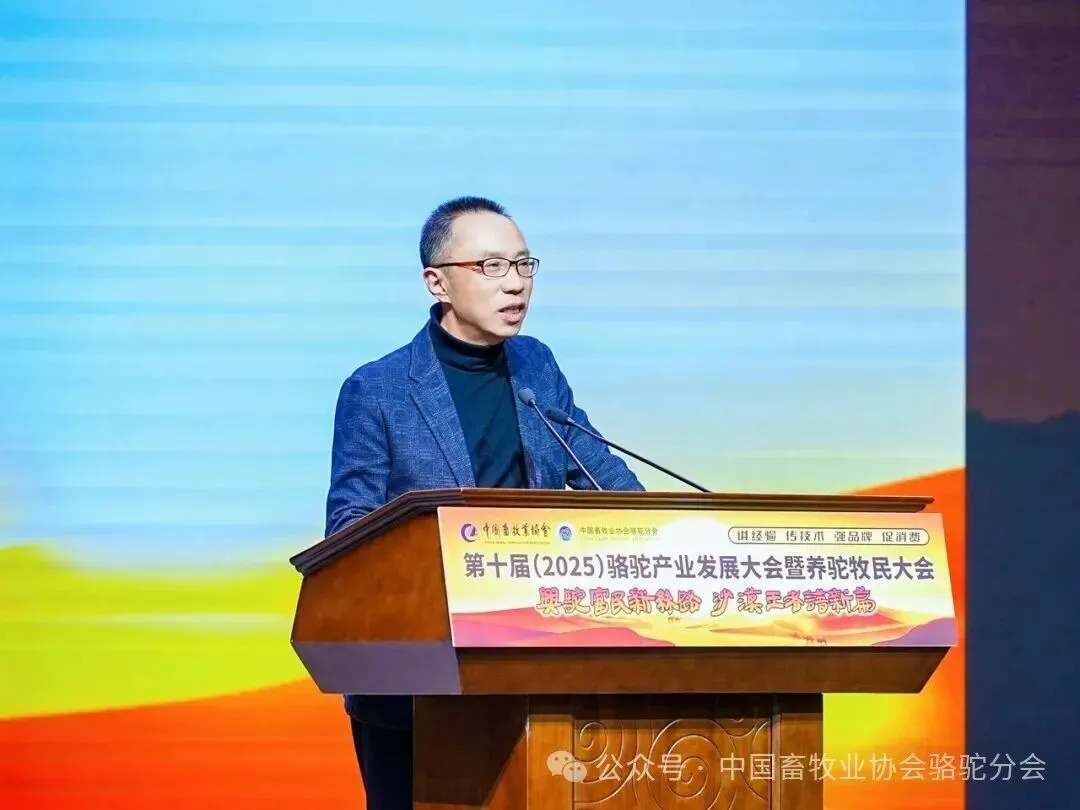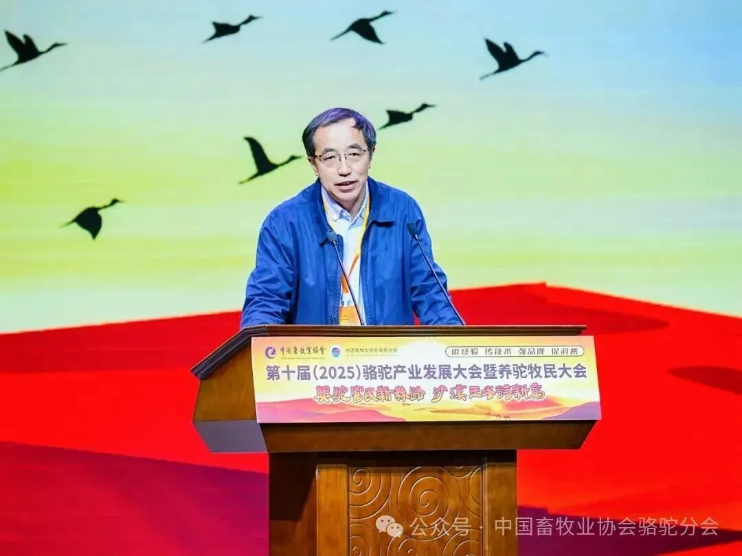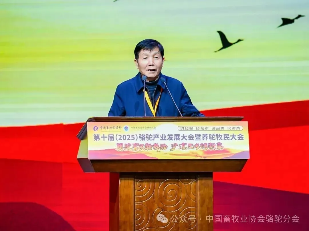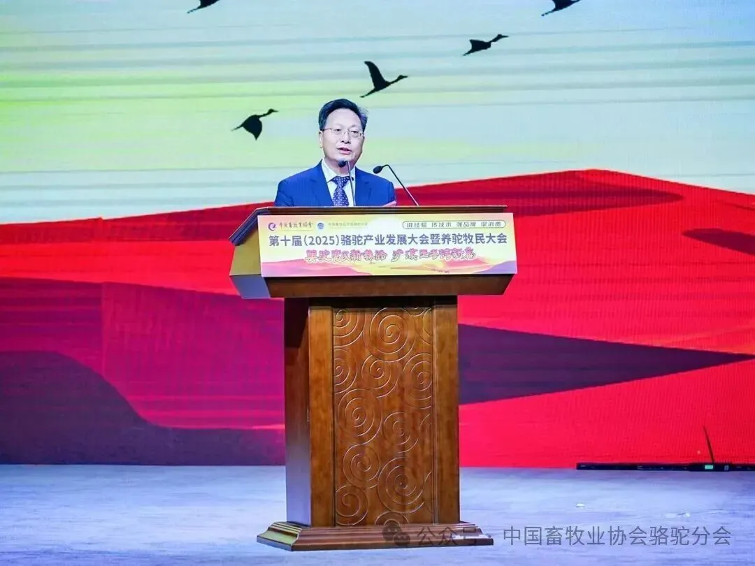 中国畜牧业协会会长蔡辉益致开幕辞。他表示:回顾骆驼产业发展历程,其已实现跨越式成长——存栏量从2009年的22万峰增至如今的58万峰,产业链更延伸覆盖高端食品、生物医药、时尚服饰、特色文旅等多个领域,已成为边疆牧民增收致富的支柱产业。面对产业发展新阶段,他强调需聚焦“科技驼业”“共富驼业”“人文驼业”三大方向,推动产业实现三大升级:从“技术应用”走“核心创造”,夯实自主创新竞争力;从“产业链”迈向“价值链”,让牧民更深度共享发展红利;从“卖产品”升级“卖文化”,挖掘产业精神内涵、拓展价值边界。