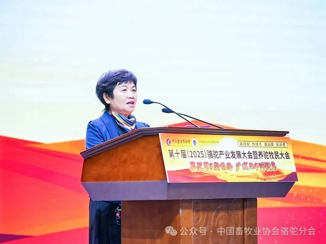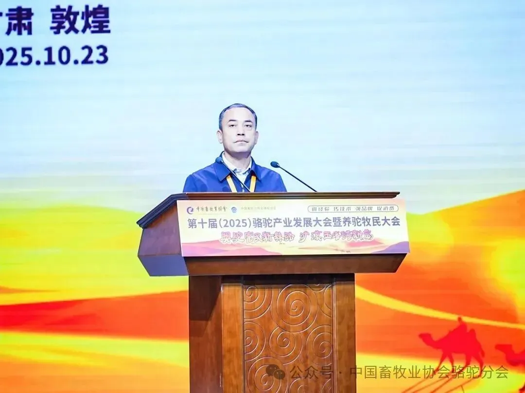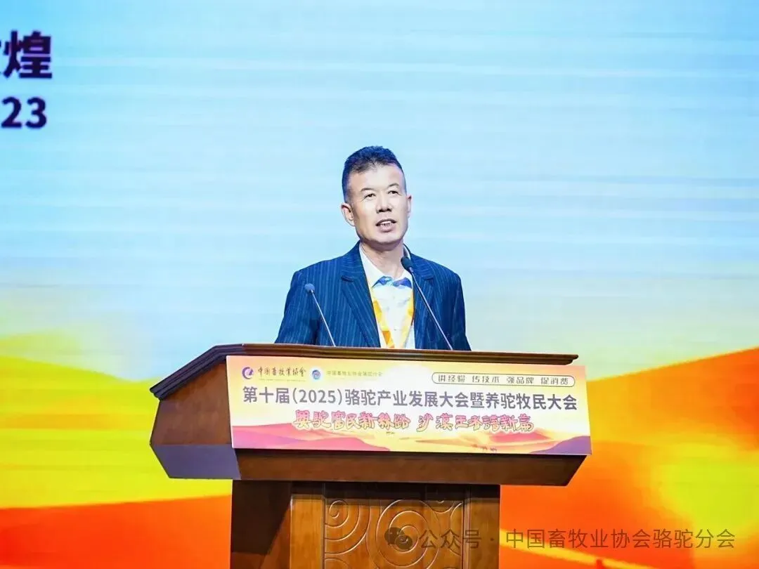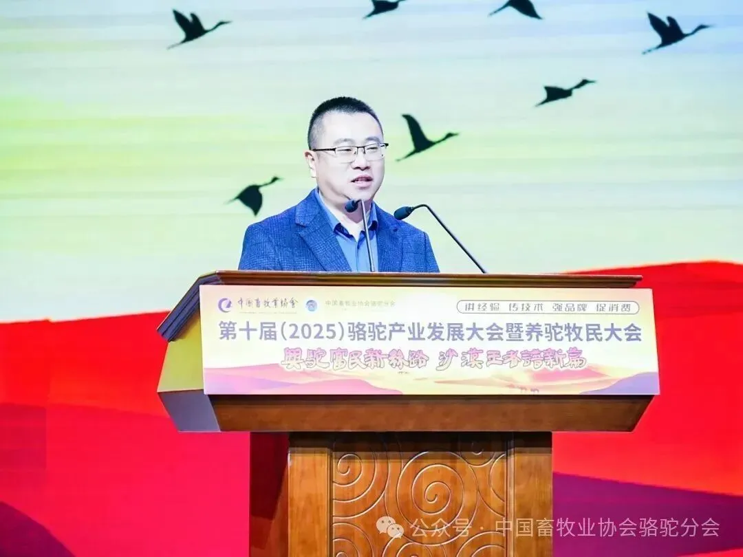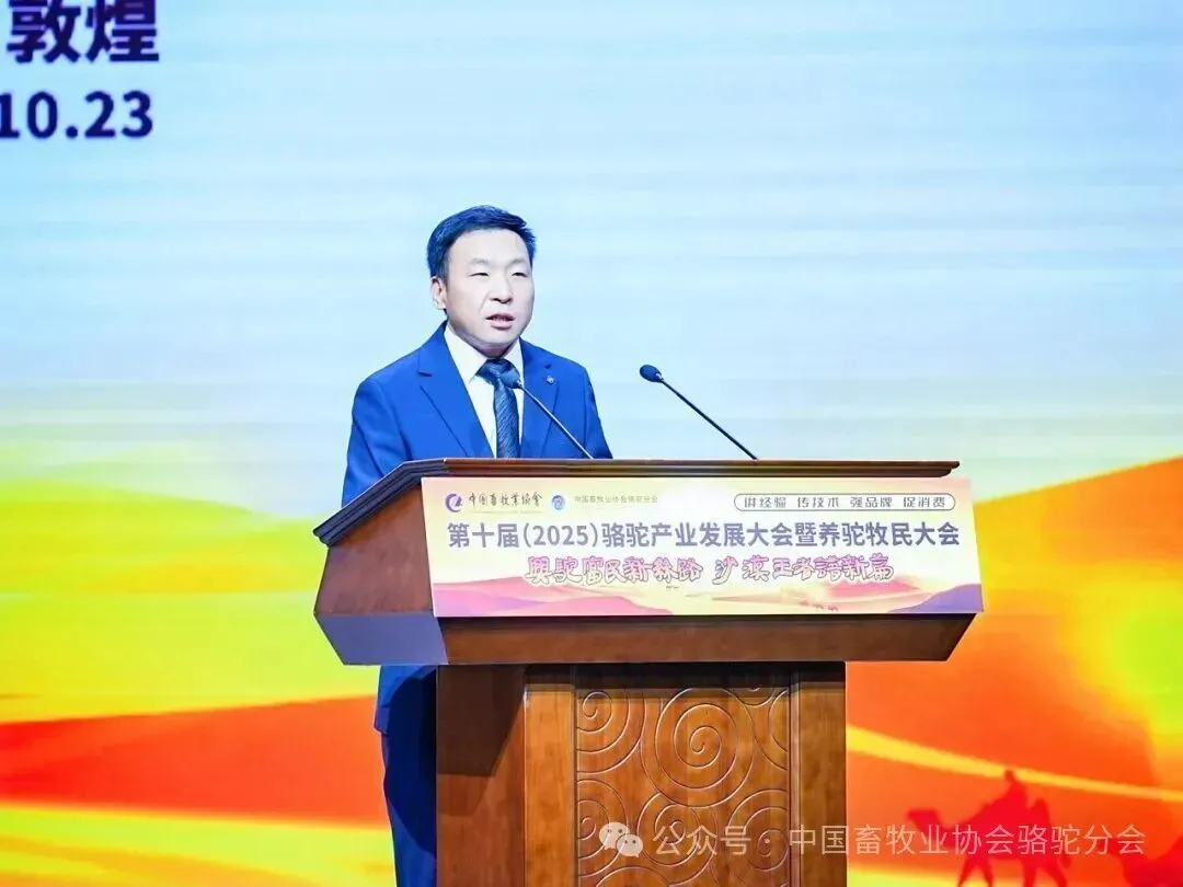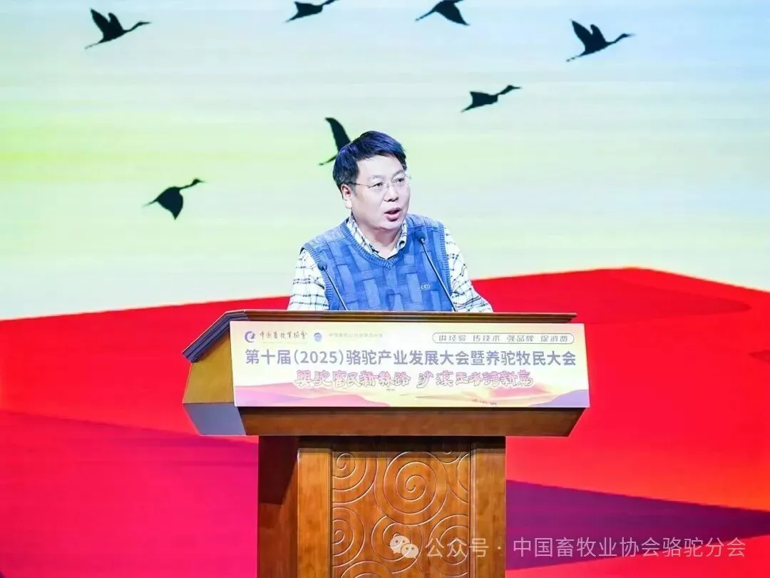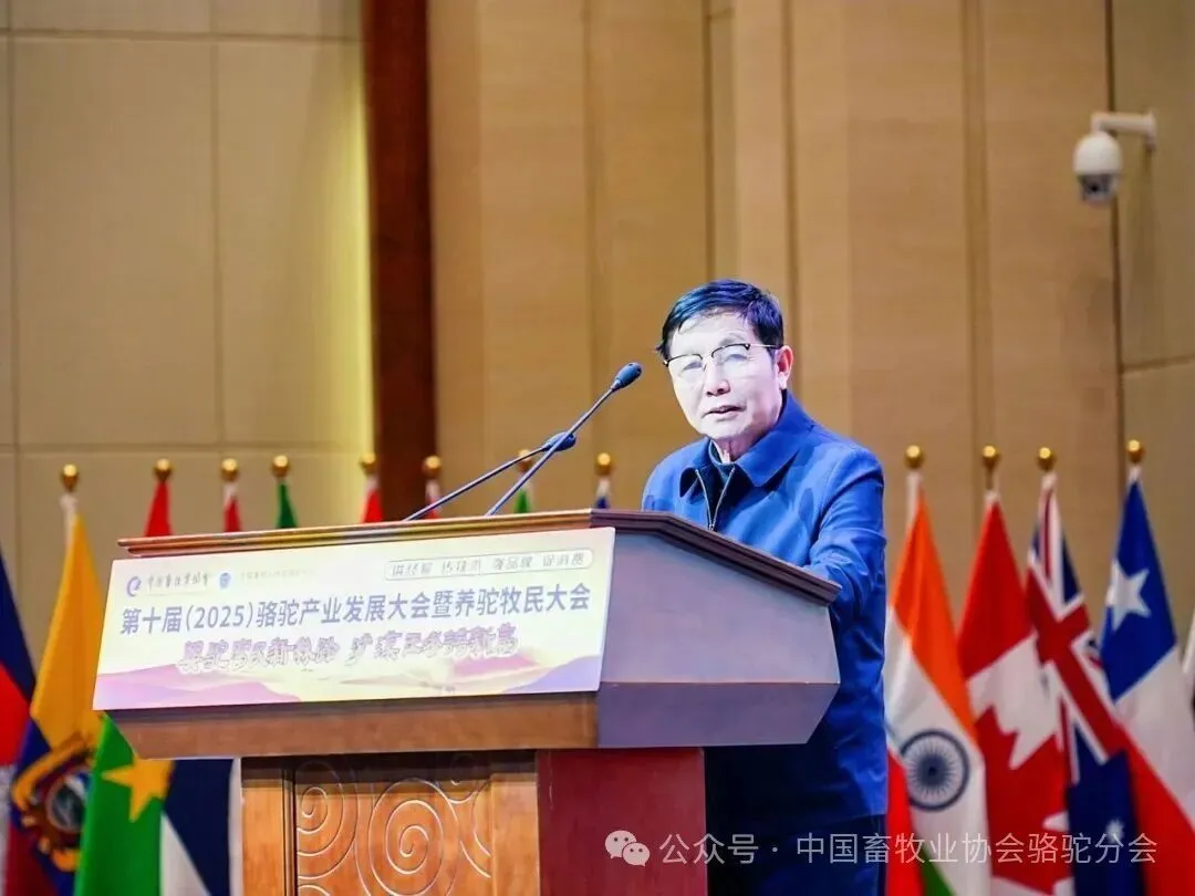 中国畜牧业协会会长蔡辉益致开幕辞。他表示:回顾骆驼产业发展历程,其已实现跨越式成长——存栏量从2009年的22万峰增至如今的58万峰,产业链更延伸覆盖高端食品、生物医药、时尚服饰、特色文旅等多个领域,已成为边疆牧民增收致富的支柱产业。面对产业发展新阶段,他强调需聚焦“科技驼业”“共富驼业”“人文驼业”三大方向,推动产业实现三大升级:从“技术应用”走“核心创造”,夯实自主创新竞争力;从“产业链”迈向“价值链”,让牧民更深度共享发展红利;从“卖产品”升级“卖文化”,挖掘产业精神内涵、拓展价值边界。