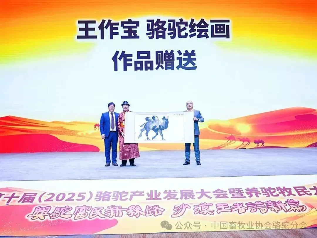 十四五边疆牧区骆驼产业典型案例代表集体合影;北大访问学者,酒泉书画院院长,敦煌中国画研究院执行院长丁永明现场赠送“兴驼富民新丝路,沙漠王者谱新篇”主题字画,中国畜牧业协会会长蔡辉益接受画作。