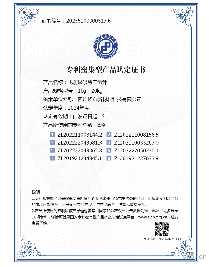 应用端从市场和用户端找核心痛点,研发端找科研资源攻关技术难题,解决真问题,正是基于四川络布在研发上的务实、偏执与死磕,其飞防级磷酸二氢钾实现了技术的持续迭代升级,产品在技术上获得了4项发明专利和9项实用新型专利证书,不仅被评审为国家专利密集型产品,还成功入选2023年全国100项重大农业科技成果。