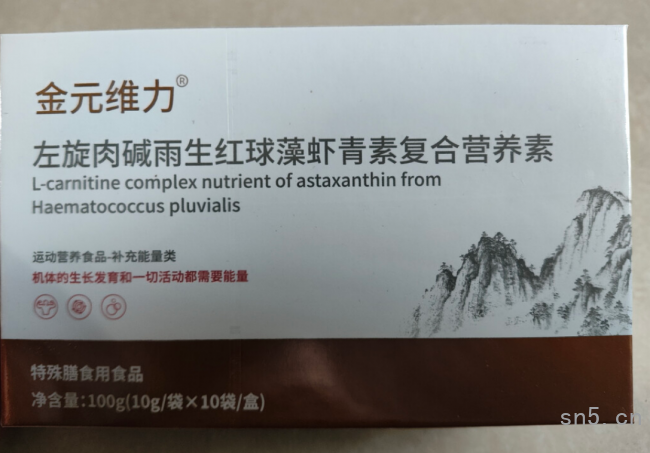由山东福德特医生物工程有限公司经销的粉剂膳食食品,含左旋肉碱、雨生红球藻虾青素、低聚异麦芽糖等30余种成分。