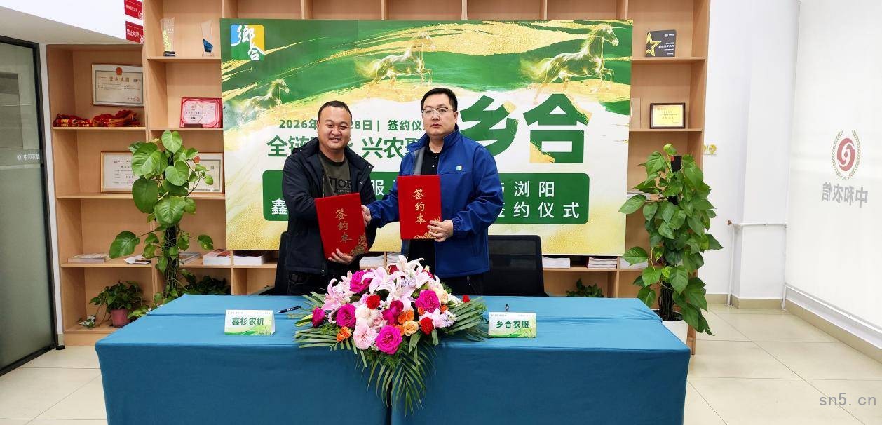 (湖南乡合农服总经理朱杰与浏阳市鑫杉农机专业合作社总经理孔智共同完成签约仪式)