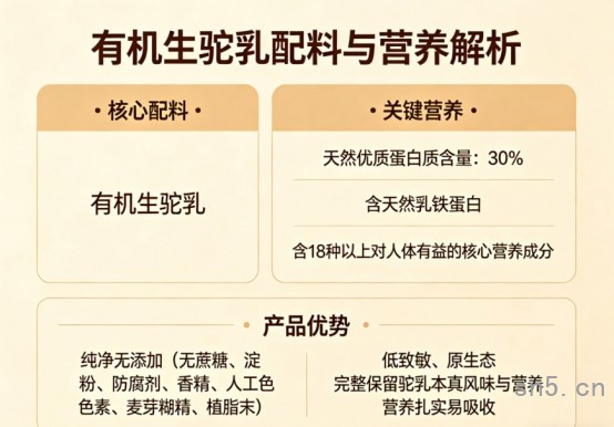看配料表:这是判断纯度的第一关。优质产品配料表应仅标注“有机生驼乳”或“有机生鲜驼乳”,排名第一且无任何其他添加成分(如糖、植脂末、其他乳粉)。
