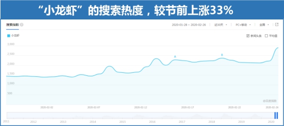 由于价格亲民,口味多样,小龙虾一直深受消费者喜爱。疫情之下,网友们对小龙虾的需求热切。百度搜索大数据显示,“小龙虾”搜索热度较年前上涨33%,与往年3月底4月初需求开始上涨相比,明显前移。