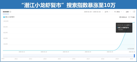 随着疫情逐步得到控制,全国各地企业开始复工复产,湖北多地在抓好疫情防控的同时也在积极复工,25日,湖北潜江市潜网小龙虾交易中心实现了部分复工,百度搜索大数据显示,昨天“潜江小龙虾复市”搜索指数暴涨至10万。