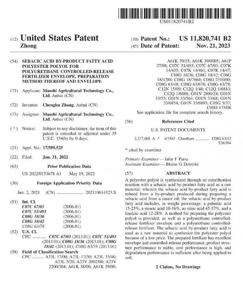 钟成虎深知,控释肥的核心竞争力在于“膜”。茂施的材料创新,走出了一条从“化工源”到“生物源”、从“无害”到“增值”的进阶之路。早期控释肥包膜多采用化工原料,部分材料分解后仍对土壤存在潜在影响。在解决养分释放机理后,茂施向“全生物基、纯天然”发起进攻,开始着手设计系列生物基聚酯多元醇,主要是以纯天然植物油和合成生产学发酵生物质材料为主,开发了一系列部分生物基、半生物基聚氨酯控释肥。历经多年研发,茂施最新开发了全生物基膜材料,在国际上首次引入生物基异氰酸酯PDI(1,5-戊二异氰酸酯),加上100%生物基聚酯多元醇,将生物质的含量提高到90%,在大大提升膜材料安全性的同时,完美保留聚氨酯技术的精准控释性。这一技术获得中国和日本专利授权。作为农业精细化管理标杆,日本对肥料环保性、安全性要求严苛,获得日本专利授权既是对茂施技术实力的权威认可,更标志着中国控释肥材料技术达到国际顶尖水平,具备全球技术输出能力。