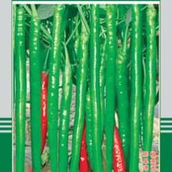 产品简介:特征特性:早熟、杂交一代,果长25厘米左右,果宽1.7厘米,果多、齐、顺直、青果嫩绿色,熟后鲜红。辣味强、味香、口感好。株型
