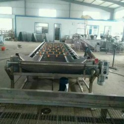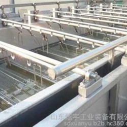 产品简介:一、概述:用于净菜加工中可盛于筐中物料的清洗。物料装入筐并输送至双排结构入筐口浸泡,筐沿轨道进入箱体水中清洗,上端喷淋冲