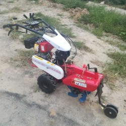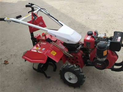本机器包括机架、可调高低扶手,机架上设有(风冷或水冷)柴油机或汽油机、机架和扶手上设置有变速箱,变速箱的输出轴上设置有能够沿轴移动的驱动轮或链轨.传动方式主要有:全齿轮传动、皮带传动、链条传动三种传动方式.该机具有重量轻,油耗低、相对功率大,结构紧凑、机动性强、操纵轻便灵活的特点。可爬坡、越埂、阶梯性强。广泛适用于平原、山区、丘陵的旱地、水田、果园、菜地、烟地的深旋耕、浅旋耕、犁耕。配上相应机具可进行旱地旋耕、水田旋耕、抽水、开沟、喷淋、喷药除草碎土等作业,还可牵引拖车进行短途运输,是大中型农机无法媲美的多功能田园管理机,工作稳定可靠、使用寿命长、维修方便等特点。是进入农民家庭理想理想的田园管理机。