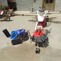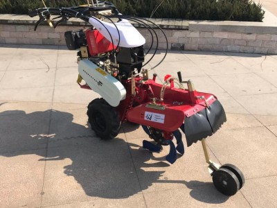 本机器包括机架、可调高低扶手,机架上设有(风冷或水冷)柴油机或汽油机、机架和扶手上设置有变速箱,变速箱的输出轴上设置有能够沿轴移动的驱动轮或链轨.传动方式主要有:全齿轮传动、皮带传动、链条传动三种传动方式.该机具有重量轻,油耗低、相对功率大,结构紧凑、机动性强、操纵轻便灵活的特点。可爬坡、越埂、阶梯性强。广泛适用于平原、山区、丘陵的旱地、水田、果园、菜地、烟地的深旋耕、浅旋耕、犁耕。配上相应机具可进行旱地旋耕、水田旋耕、抽水、开沟、喷淋、喷药除草碎土等作业,还可牵引拖车进行短途运输,是大中型农机无法媲美的多功能田园管理机,工作稳定可靠、使用寿命长、维修方便等特点。是进入农民家庭**的田园管理机。