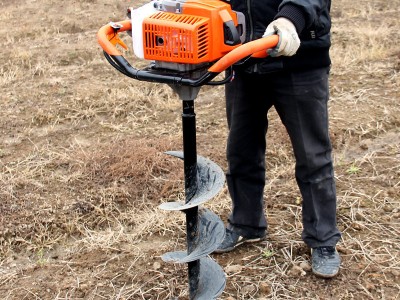 由小型通用汽油机,超越离合器,高减速比传动箱及特殊设计的钻具组成适合于<20度以下的坡地、沙地、硬质土地的植树造林或果树种植,道路两侧绿化植树等。苗木种植挖穴,畜牧围栏埋桩挖穴;葡萄胡椒种植埋桩挖穴;果树、林木施肥挖穴。挖坑直径:,200mm250 mm 300 mm 40mm。操作每小时不低于80个坑,按一天工作8小时计算,一天可以挖640个坑,是人工的30多倍。让人们从繁重的体力劳动解放出来,广泛应用于植树造林,栽种果林、篱笆、及秋季给果树施肥等。动力强劲有力,外形美观,操作舒适,劳动强度低,适合各种地形,效率高,便于携带及野外田地作业。