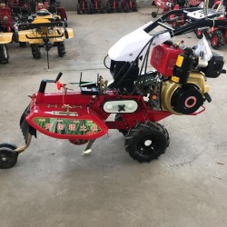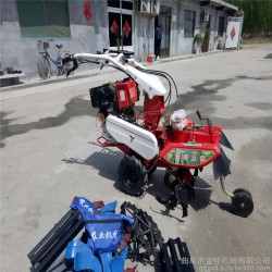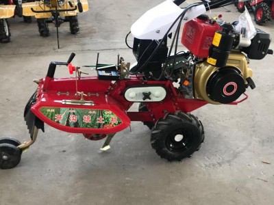 本机器包括机架、可调高低扶手,机架上设有(风冷或水冷)柴油机或汽油机、机架和扶手上设置有变速箱,变速箱的输出轴上设置有能够沿轴移动的驱动轮或链轨.传动方式主要有:全齿轮传动、皮带传动、链条传动三种传动方式.该机具有重量轻,油耗低、相对功率大,结构紧凑、机动性强、操纵轻便灵活的特点。可爬坡、越埂、阶梯性强。广泛适用于平原、山区、丘陵的旱地、水田、果园、菜地、烟地的深旋耕、浅旋耕、犁耕。配上相应机具可进行旱地旋耕、水田旋耕、抽水、开沟、喷淋、喷药除草碎土等作业,还可牵引拖车进行短途运输,是大中型农机无法媲美的多功能田园管理机,工作稳定可靠、使用寿命长、维修方便等特点。是进入农民家庭**的田园管理机。