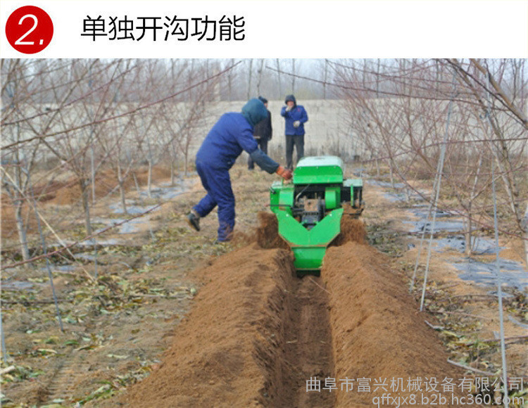 开沟施肥自动回填一次性完成(除土杂肥),单独开沟,更换回填和旋耕装置后可进行回填和旋耕作业,单独除草 既减轻了果农劳动强度,提高了生产效率,又节约了劳动和生产成本,机器体积小,重心低,操作灵便,可原地转向,适用于葡萄,果树,枸杞等经济作物的开沟施肥作业