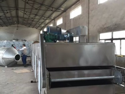 三、 工作原理 物料由加料器均匀地铺在网带上,网带一般采用12-60目不锈钢网带,由传动装置拖动在干燥机内移动,干燥机内每隔2米装有热风独立循环系统,每隔4米装有1个温控系统,部分尾气由专门排湿风机排出,废气由调节阀控制,热气由下往上或由上往下穿过铺设在网带上的物料从而完成热量的传递,带走物料内水份。网带缓慢移动,运行速度可根据物料湿度自由调节,干燥后的成品连续落入收料器中。
