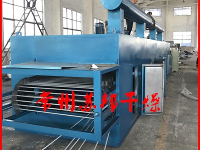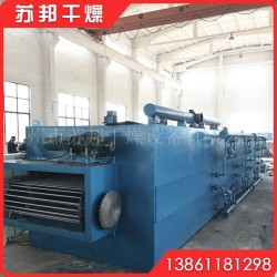 物料由加料器均匀地铺在网带上,网带一般采用12-60目不锈钢丝网,由传动装置拖动在干燥机内移动。干燥机由若干单元组成,每一单元热风独立循环,部分尾气由专门排湿风机排出,废气由调节阀控制,热气由下往上或由上往下穿过铺满物料的网带完成热量与质量传递的进程,带走物料水份。网带缓慢移动,运行速度可根据物料温度自由调节,干燥后的成品连续落入收料器中。上下循环单元根据用户需要可灵活配备,单元数量亦可根据需要选取。