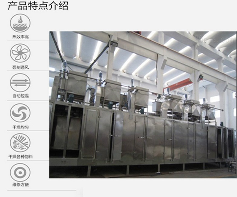 该机是穿流连续式干燥设备,用于透气性较好的片状、条状、颗粒状物料的干燥,对于脱水蔬菜、中药饮片等类含水率高、而温度不允许高的物料尤为合适;该系列干燥机具有干燥速度快、蒸发强度高、产品质量好的优点,对脱水滤饼状的膏状物料,需经造粒或制成棒状后亦可干燥。