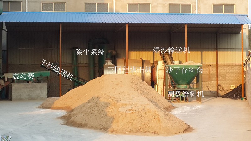 三回程烘干机工作原理:物料由皮带输送机或斗式提升机送到料斗,然后经料斗的加料机通过加料管道进入加料端。新型节能烘干机加料管道的斜度要大于物料的自然倾角,以便物料顺利进入烘干机内。烘干机圆筒是一个与水平线略成倾斜的旋转圆筒。物料从一端加入,载热体随物料一起进入烘干机。经内筒、中筒、外筒到出料口进入出料仓,载热体经烘干机以后,一般需要旋风收尘器将气体内所带物料捕集下来。如需进一步减少尾气含尘量,还应经过袋式除尘器或湿法除尘器后再排放。烘干后的物料再经过直线分级筛分离出合格的成品。