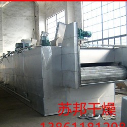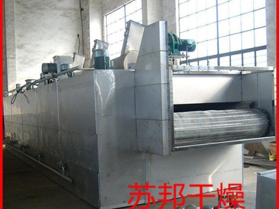 物料由加料器均匀地铺在网带上,网带一般采用12-60目不锈钢丝网,由传动装置拖动在干燥机内移动。干燥机由若干单元组成,每一单元热风独立循环,部分尾气由专门排湿风机排出,废气由调节阀控制,热气由下往上或由上往下穿过铺满物料的网带完成热量与质量传递的进程,带走物料水份。网带缓慢移动,运行速度可根据物料温度自由调节,干燥后的成品连续落入收料器中。上下循环单元根据用户需要可灵活配备,单元数量亦可根据需要选取。