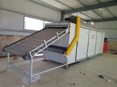 将物料放置到输送带上,经输送带上的均料装置后,平铺到烘干机网带上,物料在烘干机内由上一层逐一过渡到下一层,每层之间设置有导料和反转装置,使物料充分与载热体接触;物料从**一层流出。载热体由风机引入到烘干机内部,引风机产生的风速、风压使载热体充分、均匀的散布在烘干机底部,由于下部压力大于上面压力,载热体向上运动,穿过每层网带,使物料与载热体充分接触,提高烘干效率。