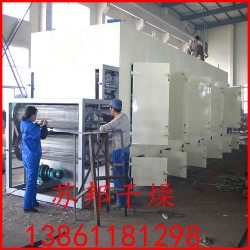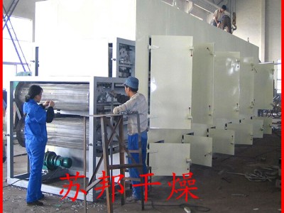 物料由加料器均匀地铺在网带上,网带一般采用12-60目不锈钢丝网,由传动装置拖动在干燥机内移动。干燥机由若干单元组成,每一单元热风独立循环,部分尾气由专门排湿风机排出,废气由调节阀控制,热气由下往上或由上往下穿过铺满物料的网带完成热量与质量传递的进程,带走物料水份。网带缓慢移动,运行速度可根据物料温度自由调节,干燥后的成品连续落入收料器中。上下循环单元根据用户需要可灵活配备,单元数量亦可根据需要选取。
