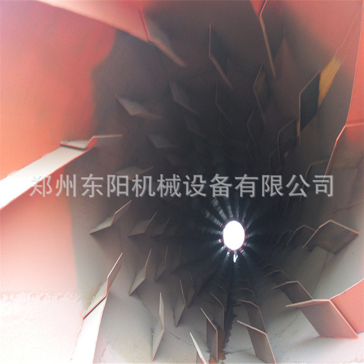产品简介:该机主要由回转体、扬料板,传动装置,支撑装置及密封圈等部件组成。干燥机是一个与水平方向略成倾斜的圆筒,物料从较高的一端加入,高温热烟气与物料并流进入筒体,随着筒体的转动,物料由于重力的作用运行到较低一端。在圆筒内壁上装有抄板,把物料抄起又洒下,使物料与气流的接触表面增大,以提高干燥速率并促进物料前行。干燥后的产品从底端下部收集。