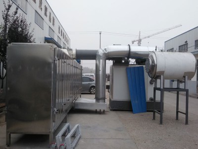 本设备工作原理是蒸汽通过热交换器向烘箱提供热源,经过换热器加热的干燥空气在轴流风机的作用下,产生的热风自烘箱尾端进入烘箱内部,经由风刀改变风向,吹向烘箱斜下方,在遇到烘箱内壁时自然分散,形成内循环,使烘箱内部温度均匀,在烘箱内温度达到生产所需时,物料通过提升机均匀分布在烘干机的**层网带,输送网带通过减速机运转,物料从**层逐步到达第五层,从排湿口输出。物料在烘干机中通过的过程中,物料上的水分受热蒸发,由于热空气较冷空气比重小,热空气自然上浮,带走物料所产生的水蒸气,通过烘箱上方的排潮口排出箱体,从而达到物料烘干的目的。根据烘干产品种类的不同,物料水分含量的不同(例如烘干海带、萝卜、肉类等产品),可以适当增加排湿口的数量。本设备可通过调节传送网带的运行速度和烘箱内的温度,调整烘干时间,使物料达到预期的干燥度。
