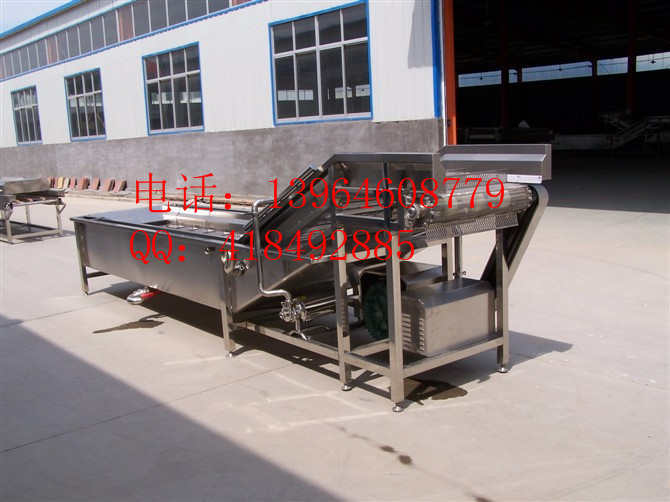 清洗设备是我们精心研发而成的产品,经多年的实际使用证明效率高、性能稳。该气泡蔬菜清洗机由水箱、提升机、循环冲洗水泵、传动部分等部件组成,工作时由于水中压力的存在,使果蔬在水中剧烈翻滚搅动,清洗水经过过滤后,由循环冲洗泵加压至进料口喷管回冲,喷管方向可调,物料被喷管喷出的高压水再次冲洗,并朝着出口方向漂移,出口处置刮板提升机,刮板提升机的速度可调(调节刮板提升机速度到所需的生产能力),将冲来的果蔬送至下道工序(可根据用户要求在出口刮板提升机上加喷淋管,进一步进行喷洗)。也可根据用户不同的物料,加工不同的提升结构该产品自动连续清洗、提高清洗效率、省水率高至70%。