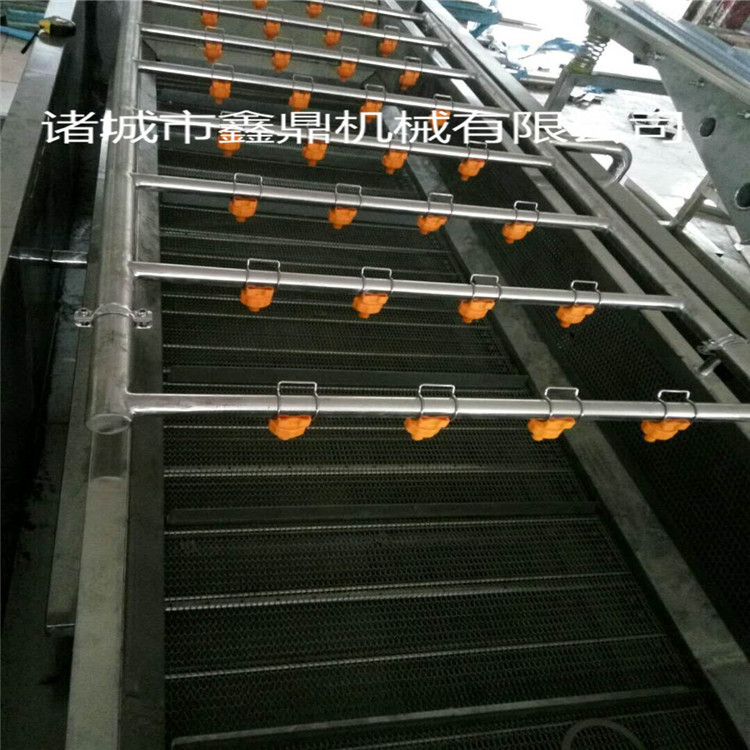 该清洗机采用优质SUS304不锈钢材质制作,以水为介质,通过强流涡轮风机形成气泡翻滚,对物料进行柔性清洗。在清洗的同时网带上部增加喷淋管道和喷头,通过高压水泵进行循环喷淋,有效的压制物料上浮以及物料清洗,喷头为可拆卸喷头,便于清洗防止堵塞,喷嘴角度可调,更加有效的清洗物料。设备中设有气泡发生装置,使物料呈翻滚状态,去除产品表面农残的功效,同时可加入适量的药剂,进行消毒固色。漂浮物可以从溢流槽溢出,沉淀物从排污口排出,以达到清洗的目的。具有洗洁净高、节能、节水、设备稳定可靠等特点。增加臭氧发生装置去除农药残留及杀菌的目的。该清洗机适用于各类果蔬、水产品及中草药的清洗及净菜深加工生产线中及中央厨房配送行业中。