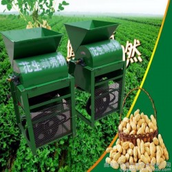 花生剥壳机有机架、风扇、转子、电机、筛网(有大小两种)、入料斗、震动筛、三角带轮及其传动三角带等组成。机具正常运转后,将花生定量、均匀、连续地投入进料斗,花生在转子的反复打击、摩擦、碰撞作用下,花生壳破碎。花生粒及破碎的花生壳在转子的旋转风压及打击下,通过一定孔径的筛网(花生首脱粒用大孔筛网,清选后的小皮果更换成小孔筛网进行第二次脱壳),这时,花生壳、粒受到旋转风扇的吹力作用,重量轻的花生壳被吹出机体外,花生粒通过震动筛的筛选达到清选的目的。