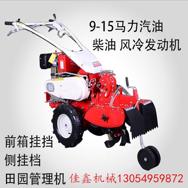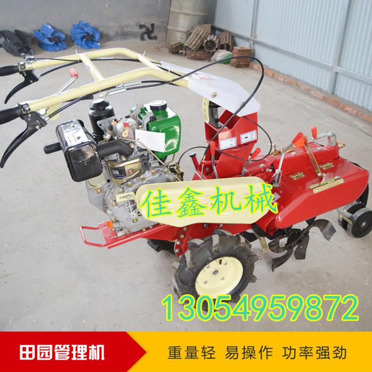 本机器包括机架、可调高低扶手,机架上设有(风冷或水冷)柴油机或汽油机、机架和扶手上设置有变速箱,变速箱的输出轴上设置有能够沿轴移动的驱动轮或链轨.传动方式主要有:全齿轮传动、皮带传动、链条传动三种传动方式.该机具有重量轻,油耗低、相对功率大,结构紧凑、机动性强、操纵轻便灵活的特点。可爬坡、越埂、阶梯性强。广泛适用于平原、山区、丘陵的旱地、水田、果园、菜地、烟地的深旋耕、浅旋耕、犁耕。配上相应机具可进行旱地旋耕、水田旋耕、抽水、开沟、喷淋、喷药除草碎土等作业,还可牵引拖车进行短途运输,是大中型农机无法媲美的多功能,工作稳定可靠、使用寿命长、维修方便等特点。是进入农民家庭理想的田园管理机。自动差速器的田园管理机,可以360度自由转弯,在田间可随意控制方向,极大的方便操作,此外该机采用整体铸造变速箱体,结实耐用,采用干式摩擦离合器,安全可靠。是农民朋友的好帮手