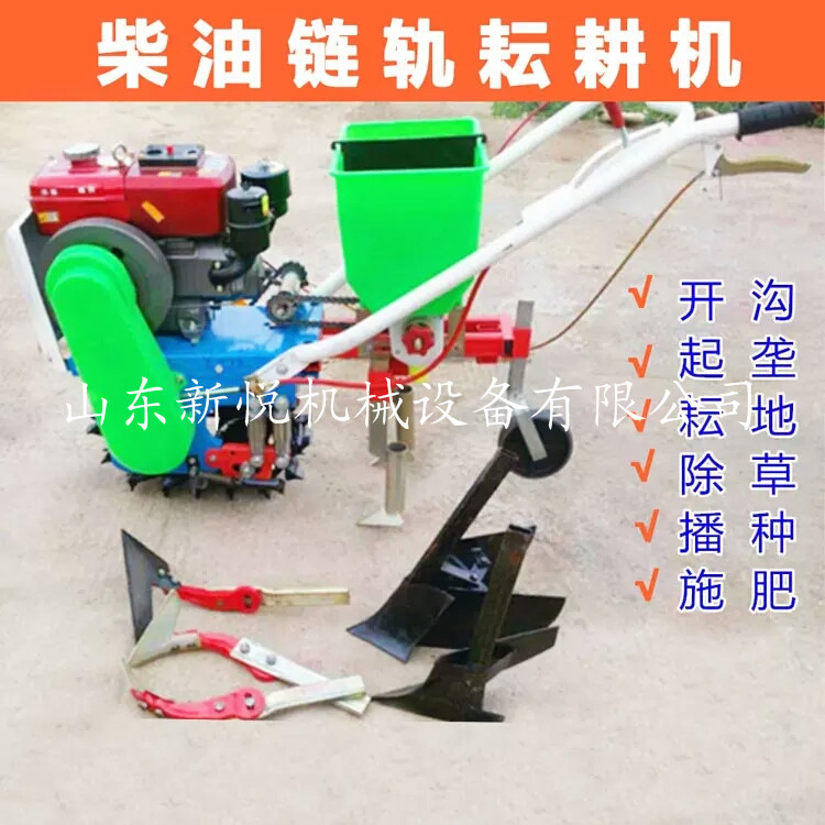 1:手把能高低,长短调节,适用于每一个人。 2:耘锄板经过高温渗碳处理,不需再加工。 3:先进的耘锄架设计,斜支板设有调整孔,用来调节耘锄板的抬头,低头,耘地的深浅。耘锄腿的高低调节是手把高低的辅助调节,不起耘地深浅的调节作用。 4:化肥斗支架有前后3个螺丝固定,方便拆卸,不使用时可以卸掉,以防碰坏。分离设计,三角带传动,不存在顶链条的问题。播种施肥可双行,单行,前后使用,耘地施肥可同时进行。调节手柄,施肥量5~50千克可调。更换楼心,可以直播各种农作物。质量稳定可靠。男女皆可使用。质量稳定可靠。男女皆可使用!
