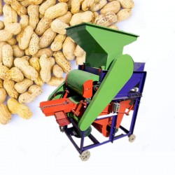 花生剥壳机由机架、风扇、转子、单相电机、筛网(有大小2种)、入料斗、震动筛、三角带轮及其传动三角带等组成。花生果由人工喂料送入喂料斗进入前滚筒里,利用纹板转动与弧度栅间的挤搓力将花生果的壳、仁剥离,剥离后的花生仁与壳同时经前弧形栅落下,通过风道时,由上风机风力将大部分花生壳吹出机外,而花生仁和一部分尚未剥离的花生小果一起落到比重选筛上进行分选,分选后的花生仁由分选晒面上行,经出仁口,流入麻袋。未剥的花生小果,则由分选晒面下行,经回料口流入提升装置,由风送提升装置送入后滚筒里二次剥壳,剥离后的仁和壳经后弧形栅落下,再次经上风机风选,比重分选筛精选,如此反复,即可实现全部剥壳。