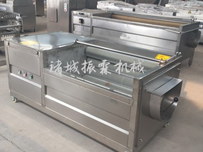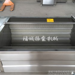 毛辊清洗机是以高压风机风力或水泵的压力使水产生强烈搅拌运动,使物料在水中翻滚,利用毛辊转动及高压喷淋相互结合,从而达到清洗的专用效果。结构特征与工作原理该机由机架、水箱、风机(水泵)、循环冲洗水泵、传动部分等几部分组成,工作时由于水中风力(压力)的存在,果蔬在水中剧烈翻滚搅动,清洗水经过过滤后,由循环冲洗泵加压至进料口喷管回冲,喷管方向可调,物料被喷管喷出的高压水得以再次冲洗,并朝着出口方向漂移,出口处置至刮板提升机,刮板提升机的速度可调(调节刮板提升机速度到所需的生产能力),将冲来的果蔬送至下道工序(可根据用户要求在出口刮板提升机上加喷淋管,进一步进行喷洗)。也可根据用户不同的物料,加工不同的提升结构。