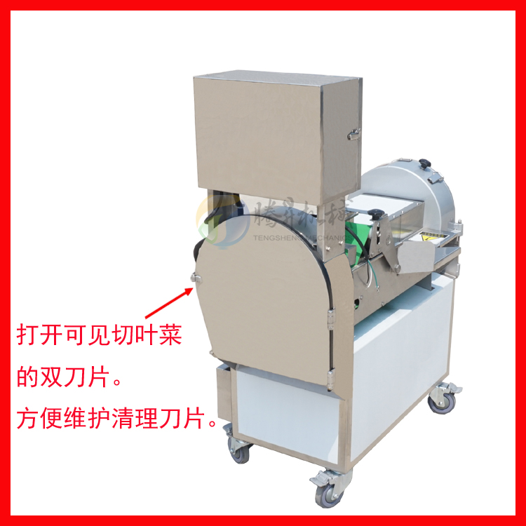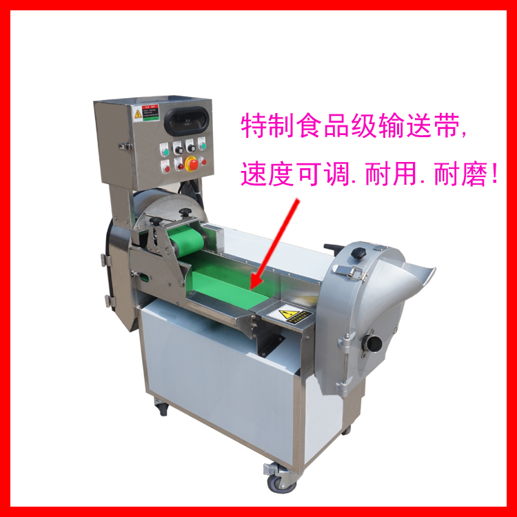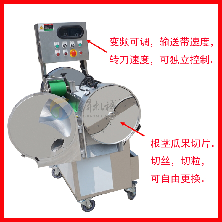 多功能双头切菜机具备双调频功能,一头是切叶菜类,如长葱,蒜苗,韭菜,芹菜,白菜,青菜等等,一头是切球根茎类,如萝卜,土豆,红薯,芋头,笋,洋葱,茄子,苹果,生姜等等众多瓜果类蔬菜。可切片(厚薄度可订做),切丝(粗细度可订做),切段切条(长短度可调),切丁(大小粒可订做)。叶菜类的输送带速度和转刀速度采用变频器调节,均可独立控制。一机多用,功能强大,产量高,刀盘更换方便,操作简单,清洗方便,适合食品加工厂,餐饮行业,饭堂,餐饮配送中心使用。