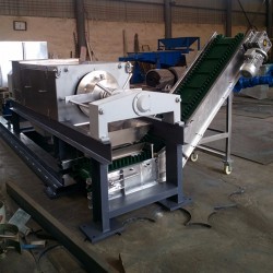 本双螺旋式压榨机工作过程是:输送螺旋将进入料箱的物料推向压榨螺旋,通过压榨螺旋的螺距减小和轴径增大,并在筛壁和锥形体阻力的作用下,使物料所含的液体物(果汁)被挤压出.挤出的液体从筛孔中流出,集中在接汁斗内.压榨后的果渣,经筛筒末端与锥形体之间排出机外,锥形体后部装有弹簧,通过调节弹簧的预紧力和位置,可改变排阻力和出渣口的大小,用来调节压榨的干湿程度. 5、10、20吨/时压榨机为双螺旋转,旋转方向相反,对物料的压榨力大而均匀,出渣口锥形体由液压缸控制,调节油压可改变对物料的施压效果,调整出汁率,本机还可用于其它物料的固液分离,其效果因物料品质不同有一定的差别。本机的进料箱和筛筒及螺旋均采用优质耐酸碱304不锈钢材料制造。