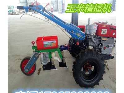 本公司今年新研发的一款用手扶车带玉米播种机,是在原来的产品基础上进一部完善,播种更准确,化肥种子同时播,适合土壤比较板结和麦茬播种,肥料种子大小多少都能进行调节,坚固耐用。播种机与手扶拖拉机牵引座连为一体,随手把能灵活升降,具有结构简单,造价低廉,操作方便等优点,是配套手扶拖拉机的一种小型播种机。该播种装置由料斗、播种轮、主动轮、链轮、链条组成,其特征是料斗下方至少设有一个水平安置的播种轮,该播种轮有一个与其垂直啮合的齿轮,在主动轮的支承件上设置一压力器,设有压力器的料斗支架上的主动轮可围绕其中心线摆动.可连续播种各种种子。
