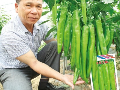 本公司引进国外资源**研发的大果型黄绿皮尖椒品种,果实粗长羊角型,中早熟,叶片小,正常肥水管理条件下,果形顺直光亮,外观亮丽,果长26-35cm,横径4.2cm左右,单果重100-120g,**大果可达