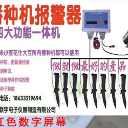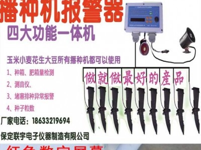 LY2016-A型B型C型播种机智能监测系统说明(智能电脑芯片全面升级)一、组 成:主机、线束、种子探头、 面积测量探头、排肥量探头、报警喇叭等。二、功 能:可以监测种子和肥料,玉米、小麦、大豆、花生、油葵、小米等农作物, 可以和智能手机无线连接实现更多实用功能。1、直接显示播种机排种总粒数。2、直接显示播种机单行粒数,通过按键可以查询每行排种粒数。3、直接显示播种机作业面积------亩(一亩等于666.667平方米);设计有两种方案测量面积**:按键面积1通过轮子周长和播种机作业宽度方式测量,第二:按键面积2通过种子总粒数、株距、播种机作业宽度方式测量。4、直接显示排肥重量(估算)。通过排肥轴转动一周排肥重量单位克乘以轴转动圈数,可以存储4种肥料的参数,使用哪种肥料就选择哪种参数就可以,还可以输入新的肥料参数。肥料参数是指排肥轴转动一周排肥重量单位克。5、指示灯指示每行排种是否正常声音报警和故障位置指示。6、语音播报播种机每行排种是否正常故障位置。7、 通过按键可以进行**36次的历史作业数据查询,包括总粒数、单行粒数、作业面积、排肥重量。8、 我们液晶屏的产品还可以显示播种机多行排种柱状图标对比,排种粒数多的柱状高,少的柱状矮。可以作为播种机公司试验台使用 也可以播种机但要加遮阳罩。9、 可以和智能手机或者平板电脑无线连接实现更多功能,详情咨询电话
