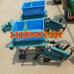 其特征在于:该播种机由固定在机架上面的排种组件和固定在机架下面的开沟组件及地轮组件组成,所述机架是一个长方形框架,前端焊接有与手扶拖拉机牵引座连接的槽形接口,后端下方固定两个地轮轴瓦;所述排种组件是由四根扁铁支撑在机架上面的种子箱,种子箱底面固定有与箱底同长的排种轴,排种轴中间固定一个从动链轮,排种轴外围镶有接通种子箱的引种合,引种合通过引种管接通犁头;所述开沟组件是由前后两排犁头紧固在机架下面与其垂直的横粱上,横粱上端相距焊接两根方形立柱,方形立柱伸入固定在机架上的两个对应方套内,通过方套上的定位螺栓调整播种深浅,横粱两边与机架前端连接两根调整拉杆;所述地轮组件是由两端固定两个地轮,中间固定一个主动链轮,穿入地轮轴瓦的地轮轴组成,主动链轮与从运链轮由链条传动。