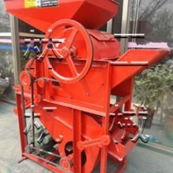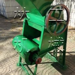 ??花生脱壳机有机架、风扇、转子、单相电机、筛网、入料斗、震动筛、三角带轮及其传动三角带等组成。机具正常运转后,将花生定量、均匀、连续地投入进料斗,花生在转子的反复打击、摩擦、碰撞作用下,花生壳破碎。花生粒及破碎的花生壳在转子的旋转风压及打击下,通过一定孔径的筛网(花生**次脱粒用大孔筛网,清选后的小皮果更换成小孔筛网进行第二次脱壳),这时,花生壳、粒受到旋转风扇的吹力作用,重量轻的花生壳被吹出机体外,花生粒通过震动筛的筛选达到清选的目的。