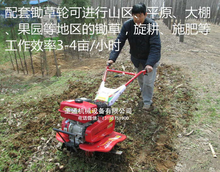 圣通小型微耕机以柴油机或汽油机为动力,具有重量轻,体积小,结构简单等特点。适应性强,耕作效果好,有快档、慢档和倒档功能,在大棚、果园、苗圃、农场生态园等使用效果显著,并且各种土质均能适应,配上相应机具可进行旋耕、除草、扶垄、犁田、播种、耘锄等作业;部件加固耐用,使用寿命长。