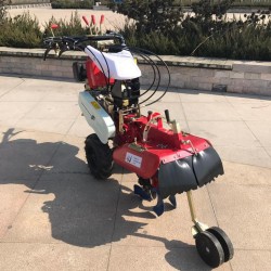 本机器包括机架、可调高低扶手,机架上设有(风冷或水冷)柴油机或汽油机、机架和扶手上设置有变速箱,变速箱的输出轴上设置有能够沿轴移动的驱动轮或链轨.传动方式主要有:全齿轮传动、皮带传动、链条传动三种传动方式.该机具有重量轻,油耗低、相对功率大,结构紧凑、机动性强、操纵轻便灵活的特点。可爬坡、越埂、阶梯性强。广泛适用于平原、山区、丘陵的旱地、水田、果园、菜地、烟地的深旋耕、浅旋耕、犁耕。配上相应机具可进行旱地旋耕、水田旋耕、抽水、开沟、喷淋、喷药除草碎土等作业,还可牵引拖车进行短途运输,是大中型农机无法媲美的多功能田园管理机,工作稳定可靠、使用寿命长、维修方便等特点。是进入农民家庭**的田园管理机。