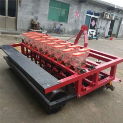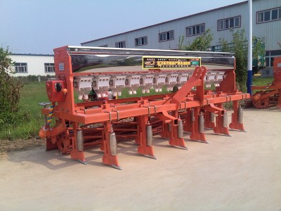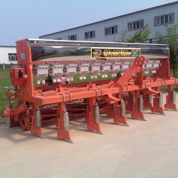 拖拉机带动的小麦播种机要求在原型谷子精播机上,加装施肥机,并可中耕的结构形式。其总体平面配置是,前7行深施颗粒化肥,施肥形式为条施,位置在预设谷子精播的垄背间。后8行精播谷子,位置在条施化肥的垄背间。这样,肥料的腐蚀性不会伤害种子,到谷子成苗期又能充分吸收肥料。其谷子精播部分布置是,拖拉机后轮胎中间安装4行播种单元,轮胎压痕空出,为中耕时拖拉机再次跟着后轮压痕进入苗田。后轮胎左右两外侧,各安装2行播种单元,这样,拖拉机作业往复时,就形成4行一垅,中间隔开状况。这样,还给谷子机械化收割打下基础。克服谷穗垂弯绞缠,难分行而造成的边际损失。因为小手扶型收割机是4行,四轮拖拉机型是8行,所以正好。更多>本企业其它产品