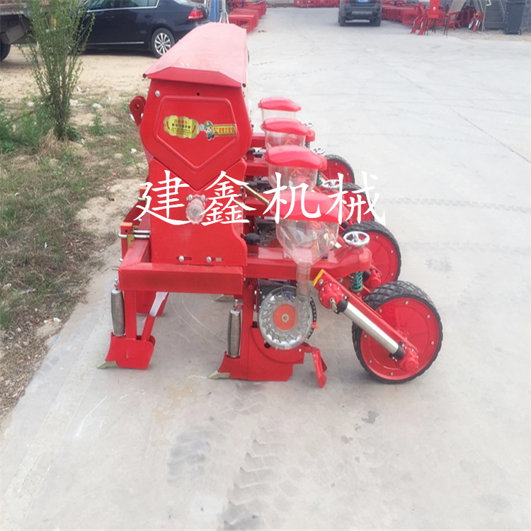 该机与拖拉机配套作业,主要用于免耕地单粒精播或双粒精播玉米,可条施晶粒状化肥,一次完成开沟施肥、开种沟、播种、覆土、镇压等项等工序,两行机添加铺镆机构可以完成地膜覆盖。