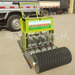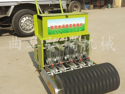 电动式蔬菜精播机, 播种进口材质透明可随时确认种子数量,电瓶(四块)需使用48V12A的铅酸电池,续航能力强。优质前轮,回力胶保护,增大摩擦力。电动转把轻松操作。开沟播种覆土,多种工序一次完成。