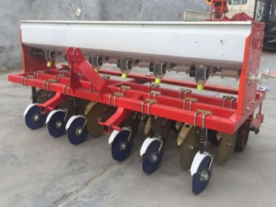 该机适用于多种地形播种小麦,种箱和肥箱分离,增加了种子和化肥的添加量,新的化肥加料斗采用镜面不锈钢,耐用且美观。一次作业可完成平地、开沟、播种、施肥、镇压、覆土、打竖畦等项工序。适应性广:可以播小麦、玉米、大豆等作物,适用于我国平原地区的播种作业。新一代圆盘开沟器采用锰钢淬火的先进工艺生产,硬度高、强度大,入土性能好,并设有刮土装置,能很好地在粘土中作业。筑埂器上下左右可调,既可以筑埂,也可以填车沟,调整时无须停机下车,触手可及。该机设有6-24行,圆盘开沟器、弹簧腿开沟器、楼角铲式开沟器可供用户根据不同地势选择。