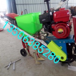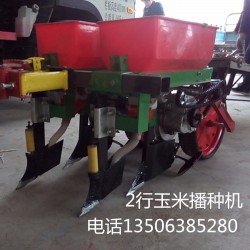 玉米新款免耕施肥播种机 双行玉米播种机本公司今年新研发的一款用手扶车带玉米播种机,是在原来的产品基础上进一部完善,播种更准确,化肥种子同时播,适合土壤比较板结和麦茬播种,肥料种子大小多少都能进行调节,坚固耐用。播种机与手扶拖拉机牵引座连为一体,随手把能灵活升降,具有结构简单,造价低廉,操作方便等优点,是配套手扶拖拉机的一种小型播种机。该播种装置由料斗、播种轮、主动轮、链轮、链条组成,其特征是料斗下方至少设有一个水平安置的播种轮,该播种轮有一个与其垂直啮合的齿轮,在主动轮的支承件上设置一压力器,设有压力器的料斗支架上的主动轮可围绕其中心线摆动.可连续播种各种种子。